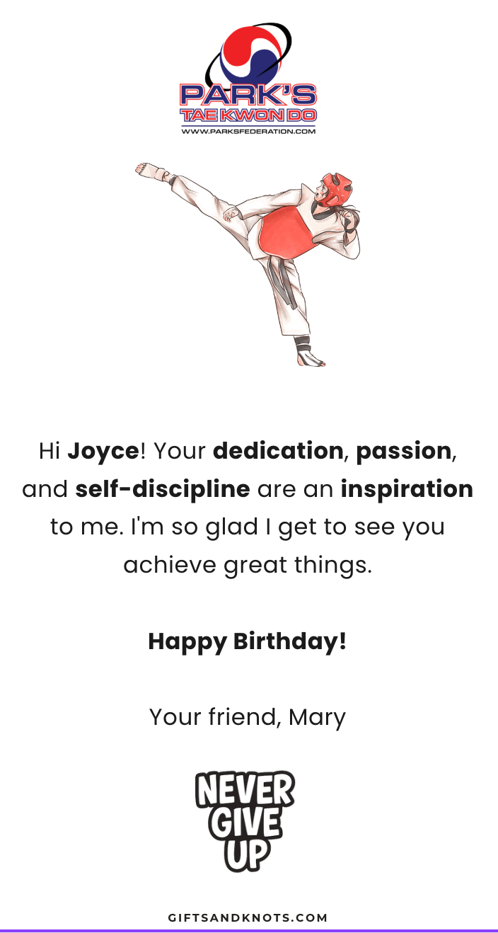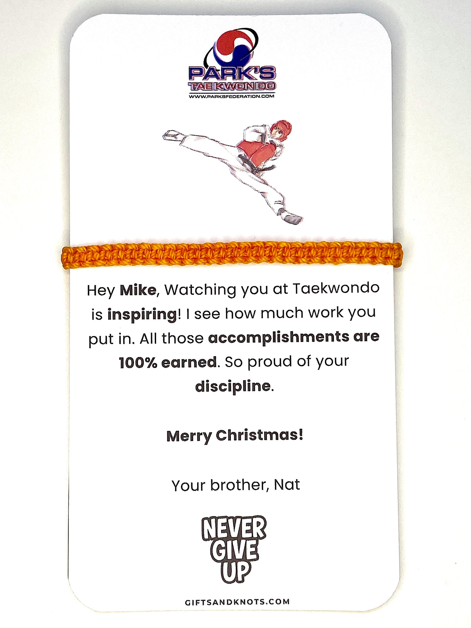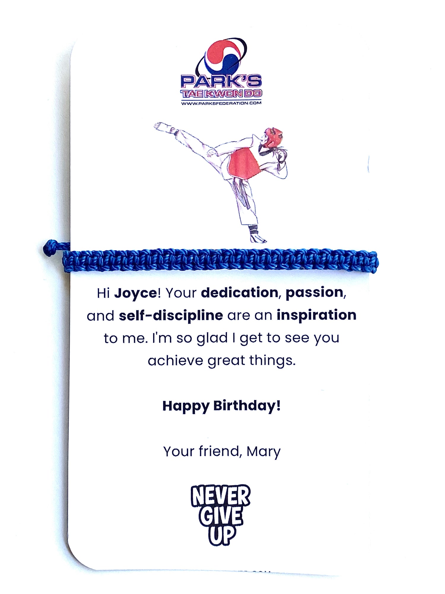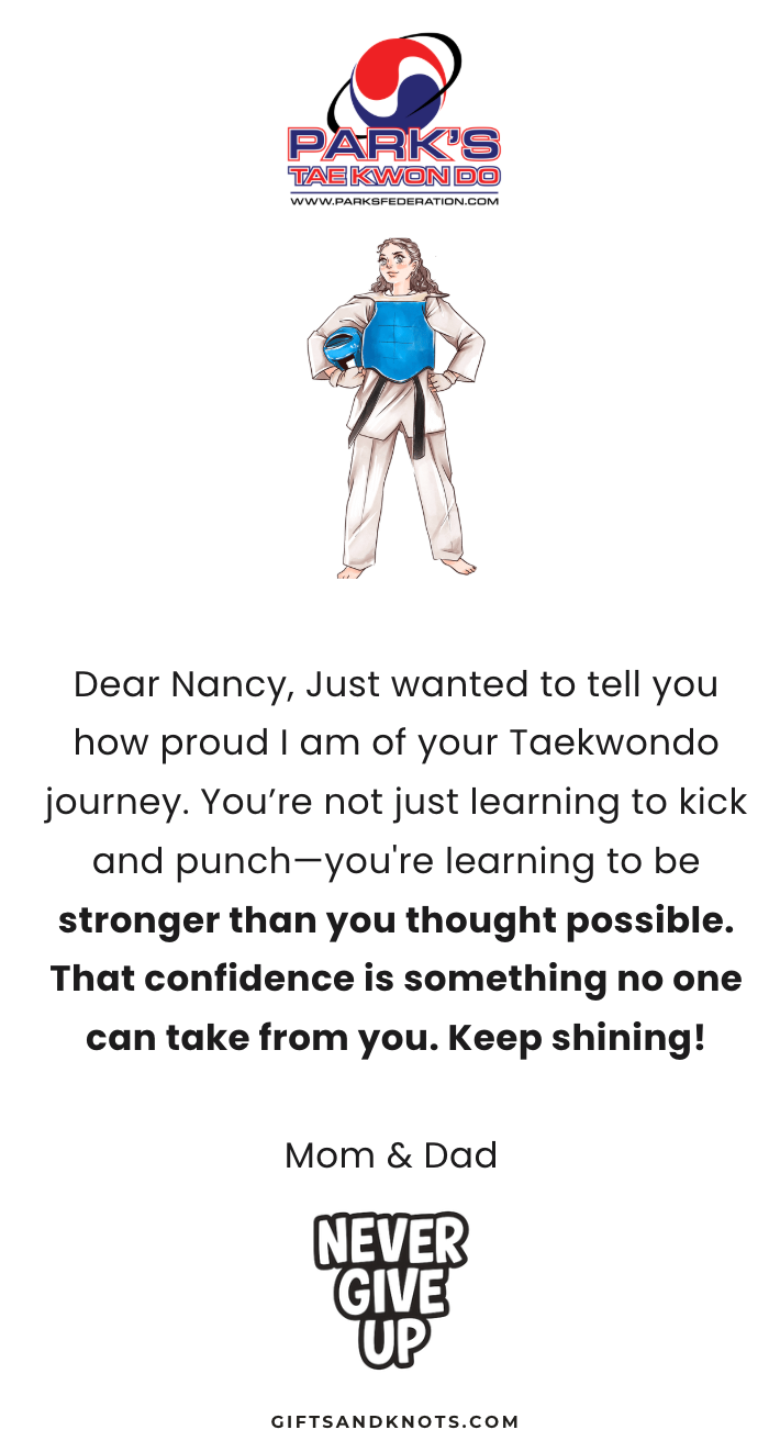 Express your love and pride to your Taekwondo athlete with a personalized message card and bracelet set.